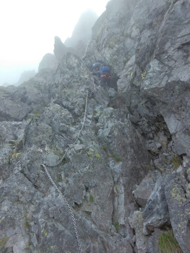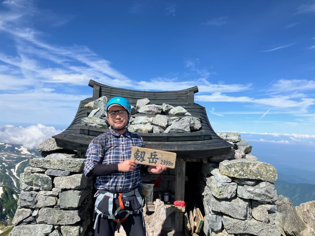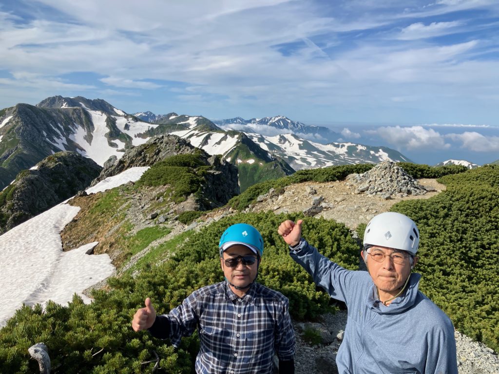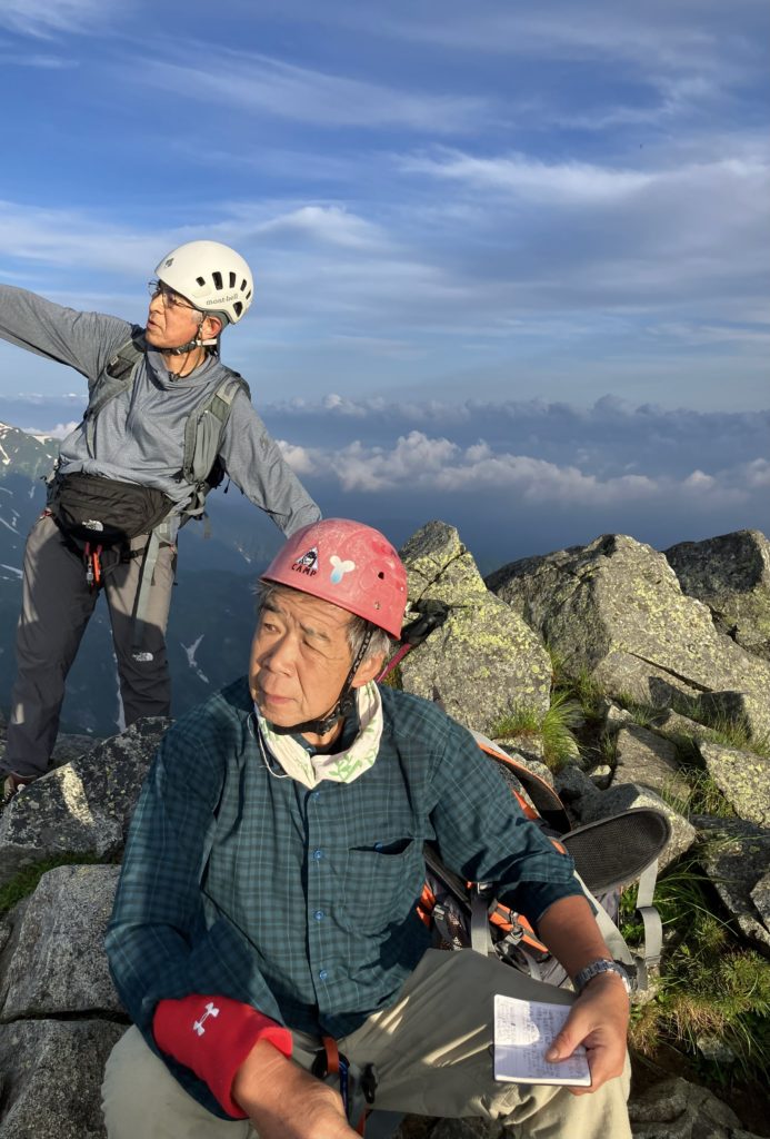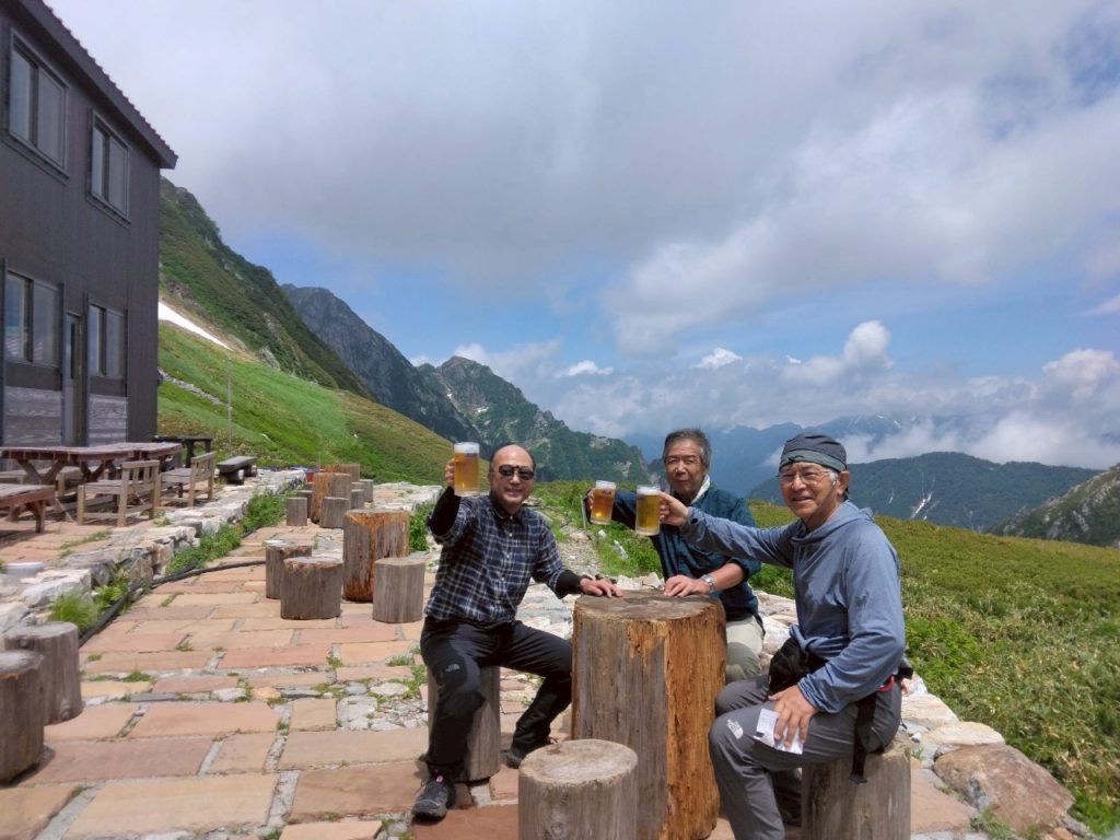 山頂での夢のようなひと時を後に下山を開始する。カニのタテバイに重なる復路は、カニのヨコバイという岩場を這う鎖場であった。一歩踏み外すと奈落の底となるハイリスク圏のため、リーダーの指示によりスリングを横張鎖に掛けて慎重に降りる。鎖場は一歩目の足場がブラインドになっており慎重に足場を確保しつつ、歩を進めてヨコバイを無事通過。さらに岩場を降りると約10mの梯子を垂直に降下して、平蔵のコルでひと息。前剣北へと登り降りを重ねて一服剣まで下る。途中、岩陰に咲くクロユリが美しく夏山の気配を感じる。その後、半時間で剣山荘に帰着。無事登頂に感謝し、乾杯したビールは最高に美味しかった!