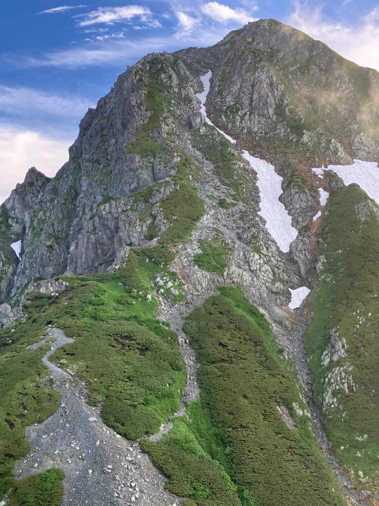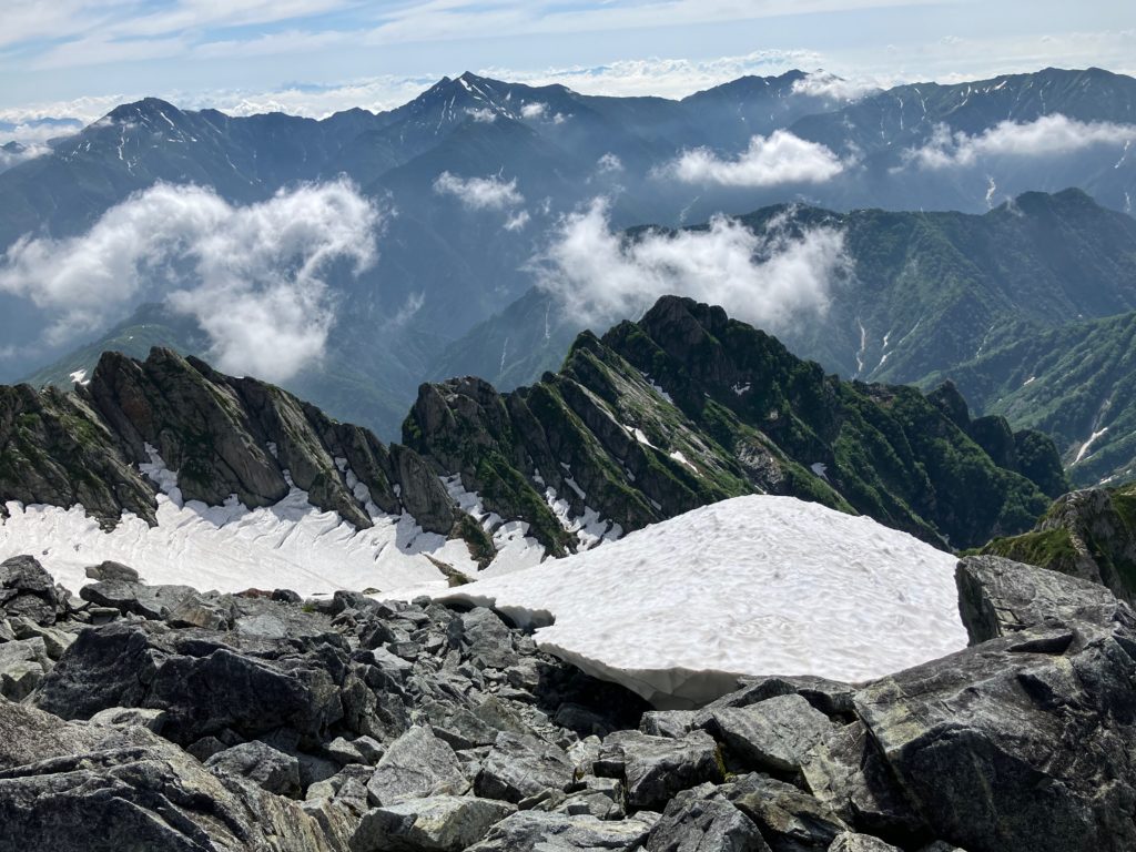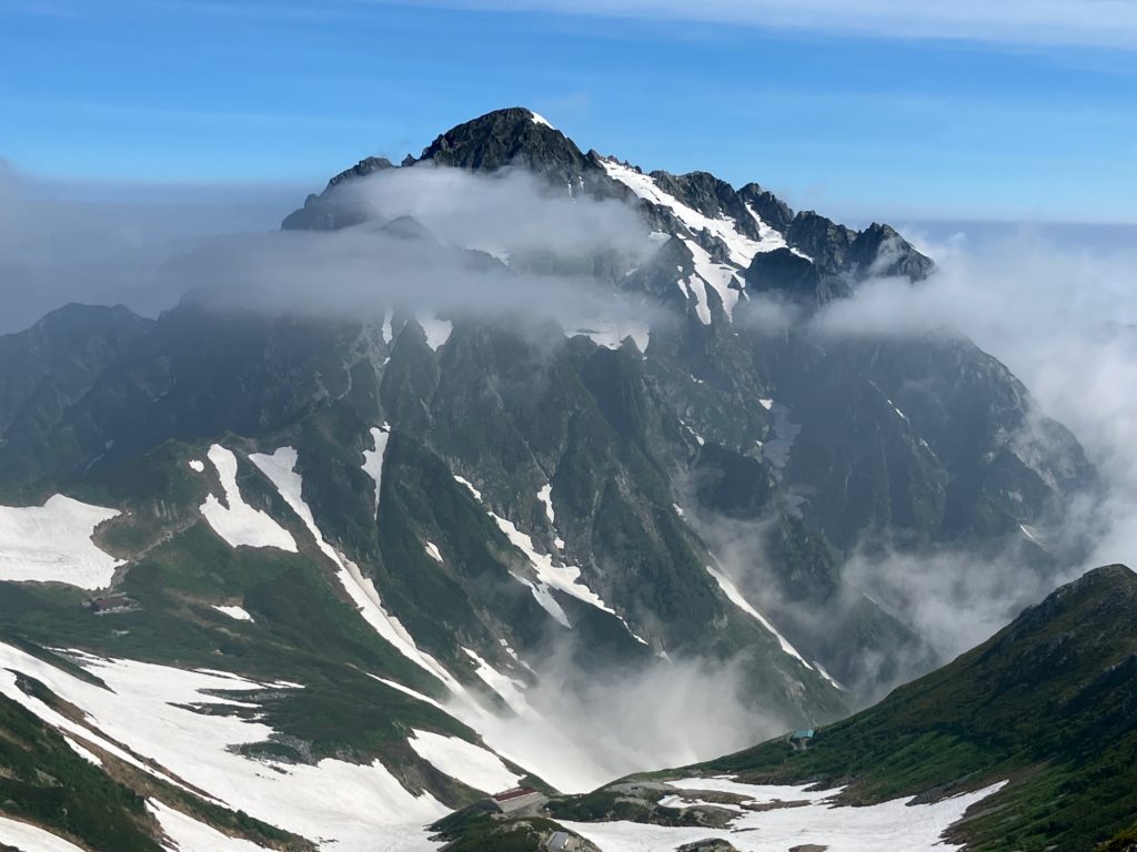 7月7日 剱岳登頂の興奮冷めやらぬ中、剣山荘を6:20出発。先ずは別山へ向かって剣沢野営場まで剣沢雪渓を登る。雪渓の登りは意外と高低差があり消耗してしまった。別山取付きから夏道で稜線に出て、別山分岐に到着。ザックをデポして別山ピークへ向かうと、早朝は雲に隠れていた剱岳の雄姿が眼前に現れた。やはり剱岳は荘厳で美しく、夢中で写真を撮る。余韻を楽しんだ後、剣御前小屋で小休止。さらに半時間でピーク2570mを経て、夏道を雷鳥沢雪渓まで下る。高山とはいえ、初夏の陽射しが容赦なく体力を奪う。最終雪渓を渡り雷鳥沢野営場に着いた頃にはヘロヘロで、階段を一歩ずつ上がるのがやっと。雷鳥荘、ミクリガ池を経て無事に室堂、立山駅へと下山した。 今回、憧れの剱岳登頂に導いていただいた早田リーダー、石橋氏に深謝いたします。