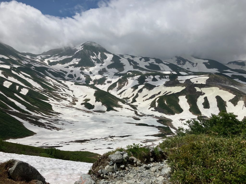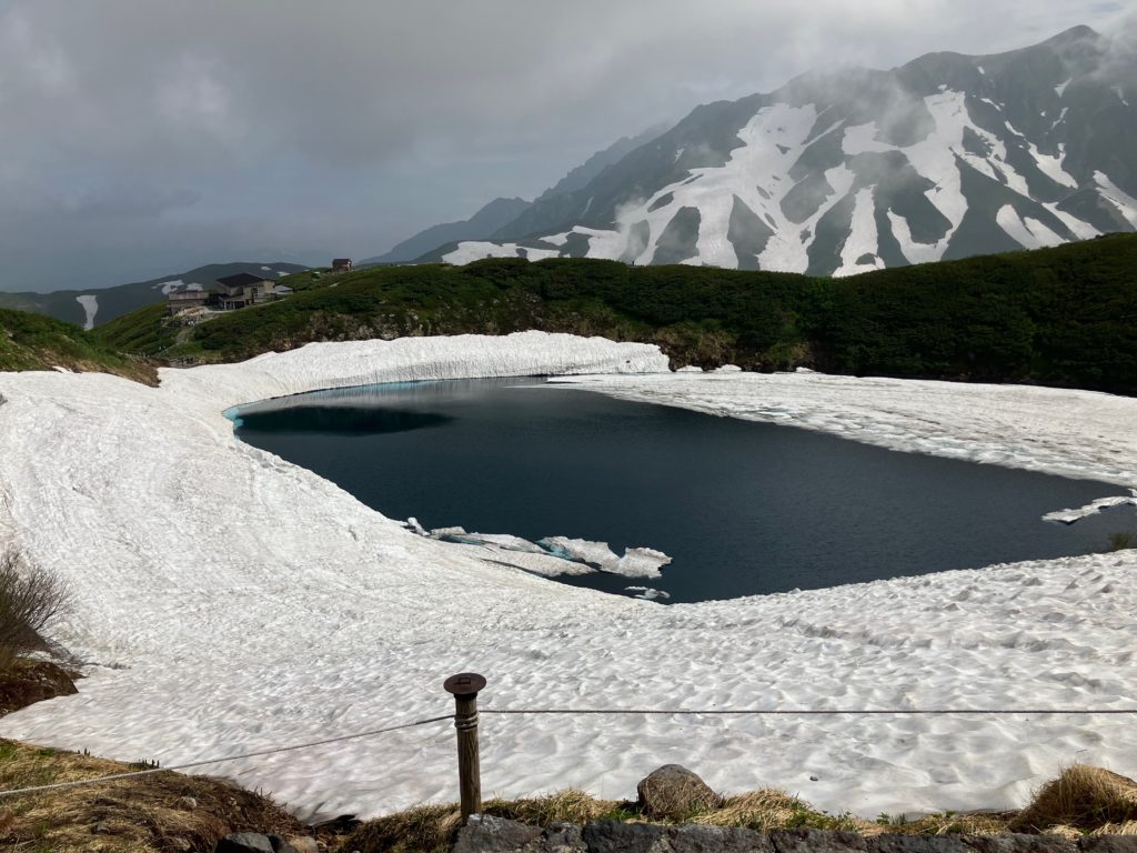 7月5日 立山駅からケーブルカー、バスを乗り継ぎ室堂に到着。室堂駅舎を出ると7月と言うのに残雪の多さに驚く。とはいえ、雪解けの緑は早春の風情でチングルマ、イワカガミ、コバイケイソウ等の花が咲き始めている。半分凍っているミクリガ池を横目に進み、雷鳥荘を経て雷鳥沢野営場へ降りる。ここでアイゼンを履き雪渓を横断し、ひと汗かいて夏道に辿り着く。夏道を約1時間登り、剱御前小屋へ到着。昼食休憩をとった後、剱沢へ約1時間下る。剱沢雪渓も残雪が多く、再びアイゼンを装着してトラバース。開荘前の剣沢小屋で会った山岳警備隊の方から「今年は残雪が多いので気をつけて」と助言あり。雪渓を抜けたころに降り始めた雨が強くなり雨具を着用し、雪渓の縁を辿って剣山荘に到着。雨に濡れた衣類を乾かせる乾燥室が有り難かった!