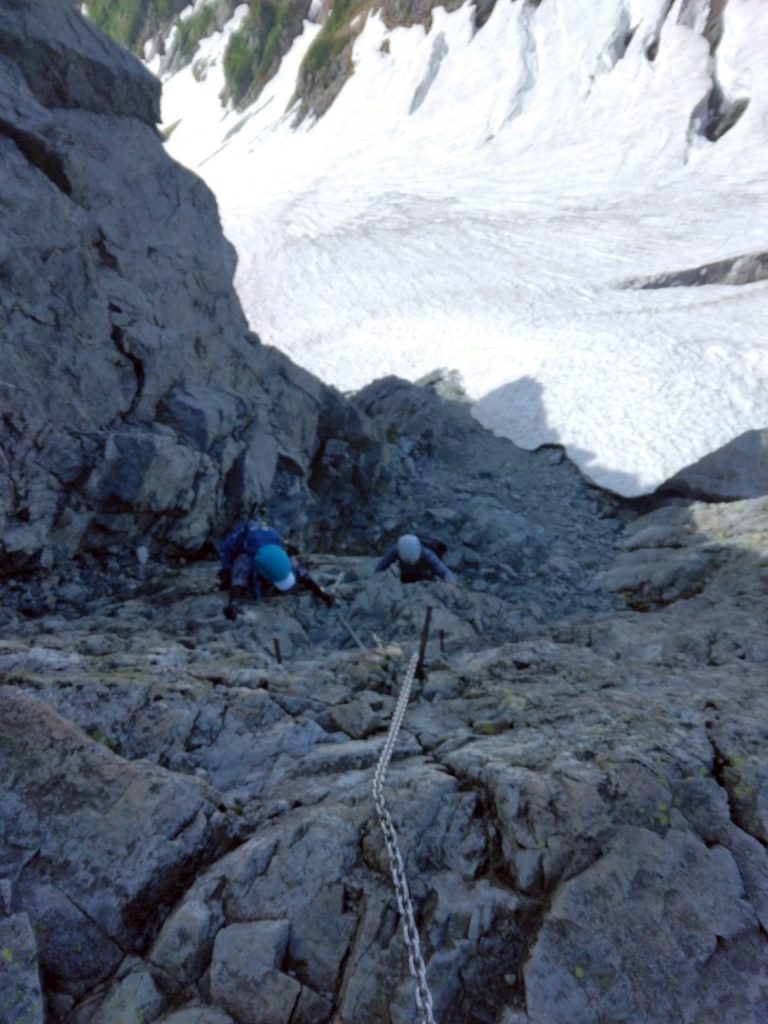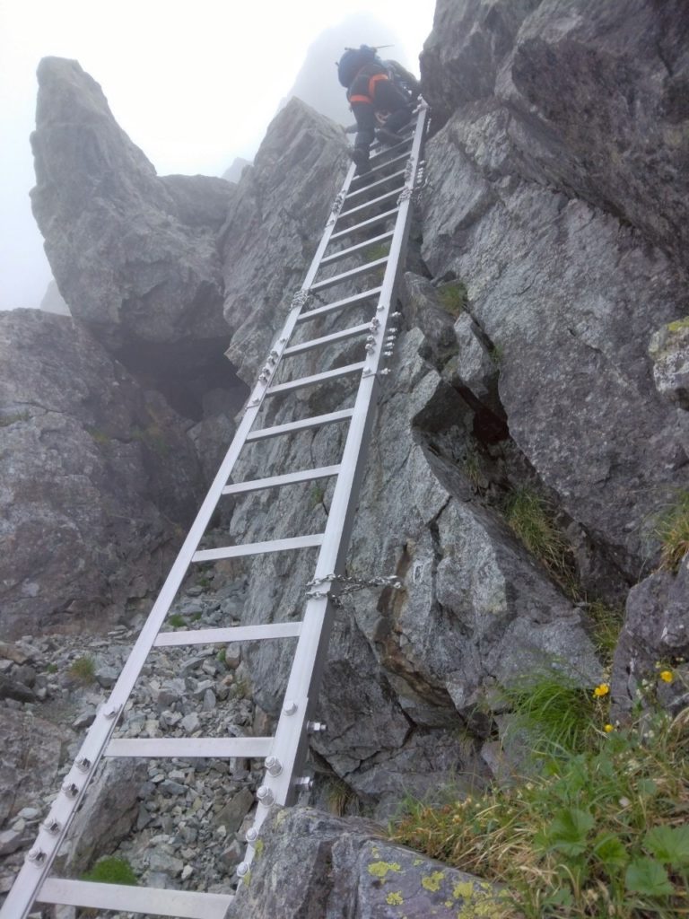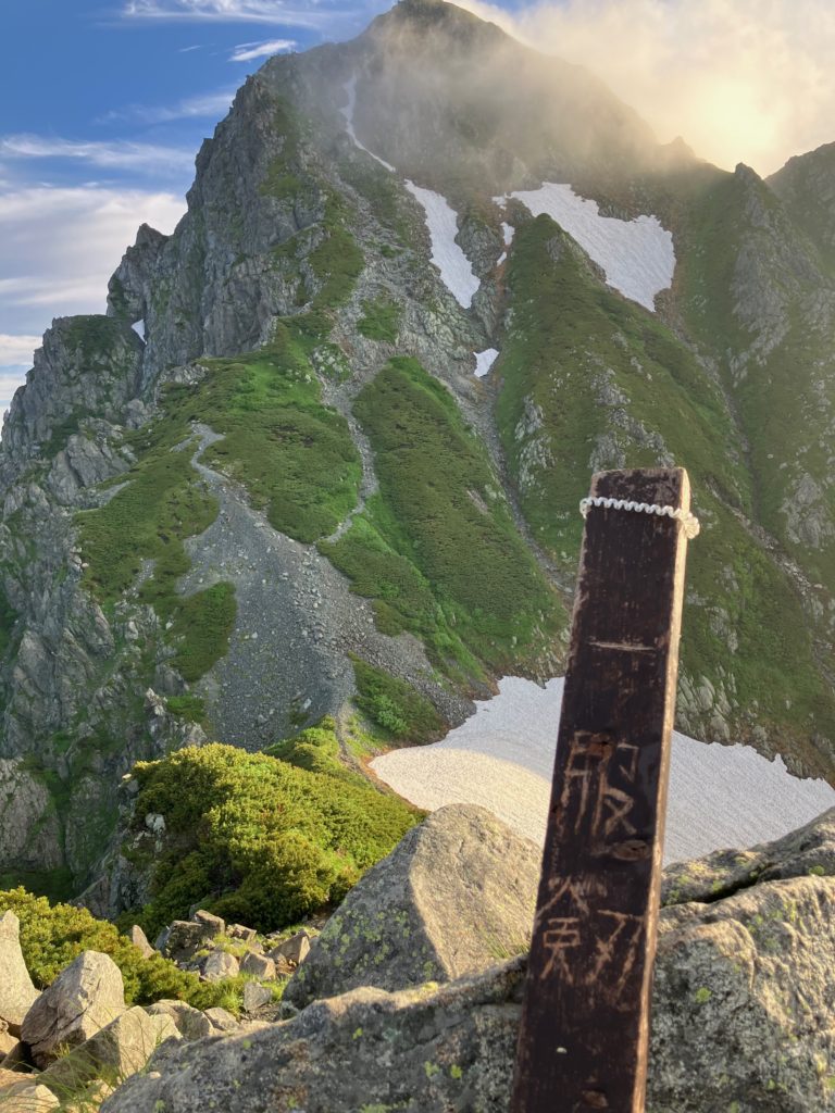 7月6日 いよいよ憧れの剱岳へ向かう朝、天候は上々で風もなく落ち着いている。少しの不安と興奮の中、辺りは明るくなり始め4:50出発。山小舎から10分もしないうちに最初の鎖場にとりかかり、ウォームアップがてらに半時間の急登を越え一服剱に到達。頂上は狭く急峻なため高度感あり、振り返ると眼下に剣山荘の赤い屋根が見えた。前方には明るくなった岩稜が広がるが、剱岳の頂は未だ見えない。更に急登を30分登りピーク2660mにて小休止。武蔵のコルからは岩場が続き「浮き石注意」の表示があり、慎重に進む。急な登りと降りを繰り返しながら高度を稼ぐと前剱の大岩にさしかかり傾斜が一段ときつくなる。前剱肩からいよいよ岩稜が険しくなり、岩崖をまたぐ5mほどの鉄の一本橋を慎重に亘る。高度感が溢れる岩壁を張り付くように水平に伸びる鎖を頼りにトラバース。2本の鎖場を越えると次の難所、平蔵の頭(ずこ)。急峻な下りの鎖場を恐る恐る降りると平蔵のコルにて人心地をつく。少し体力が回復したところでいよいよカニのタテバイへと向かう。先ずは約20mの鎖が垂直にさがる鎖場。できるだけ、三点支持で足場を確保しつつ登りはじめたが、約10m登ったところで左足が滑ってしまった。咄嗟に両手で鎖にぶら下がるがズリズリと滑り恐怖に震えた。アンカーボルトを足掛かりに立て直し、一歩ずつ這い上がり鎖を乗り継いでようやく50mほどの垂直岩場を抜け出した。傾斜が緩んだ登山道を進むと斜面の先に別山尾根と早月尾根分岐を標柱があり、その先の大岩の間を抜けると小さな祠の裏に出た。祠の正面に廻ると三等三角点があり、剱岳2999mに8:45登頂。山頂は快晴、北アルプス360度のパノラマを独り占めしたような絶景であった。昨夏、白馬岳から見た剱岳の神々しい山容は圧巻であったが、剱岳山頂からは白馬、鹿島鑓、五竜、立山等の峰々と眼下に拡がる雪渓を存分に堪能することが出来た。