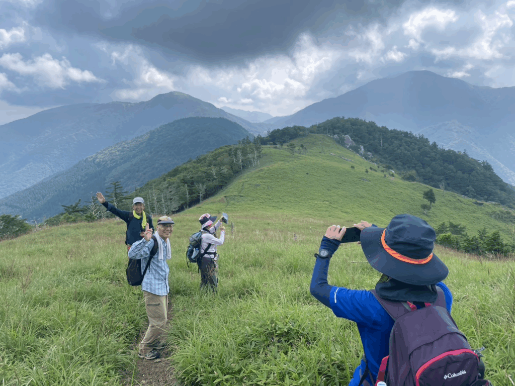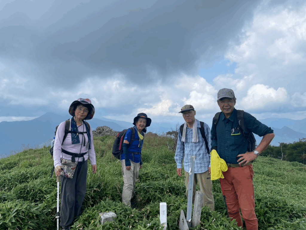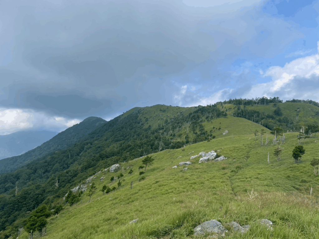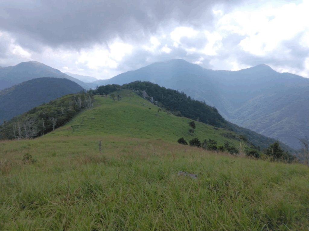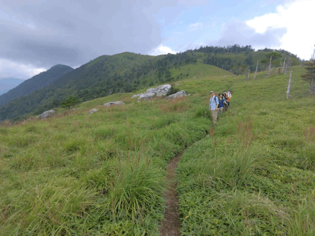 ダケカンバ等の樹林帯は緩やかな勾配でよく整備されていて歩 きやすい道でした。 9時10分頃後方に次郎ぎゅう、 剣山が見えて小休止です。 そこから笹原になり、 まるで天国に向かっていくような穏やかな坂を登ってい くと偽ピークにつき、そこから下りが始まりました。 笹原はひざ丈位伸びてお り、朝露で濡れていましたが、それもまた楽しです。 タカネオトギリの黄色、 シ コクフウロのピンク、リンドウの白、 釣鐘ニンジンの紫等の高山植物もまだまだ 元気に咲いていてくれました。