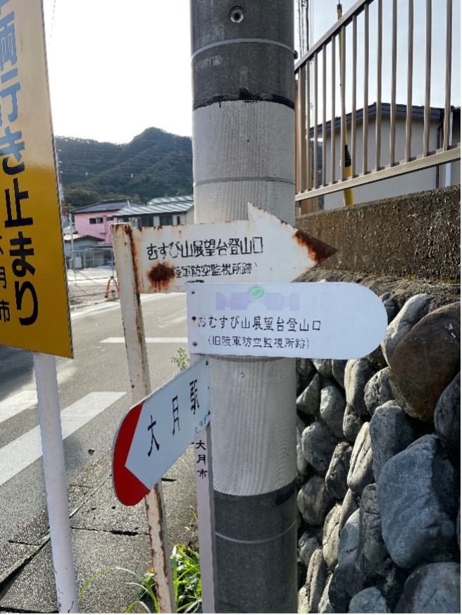 駅から30分ほど歩くと、「むすび山展望台」の標識がありました2。この標識に従って登ると、民家の庭先に道が続くのでちょっと不安になりますが、その庭先のわきに登山道が見えます。