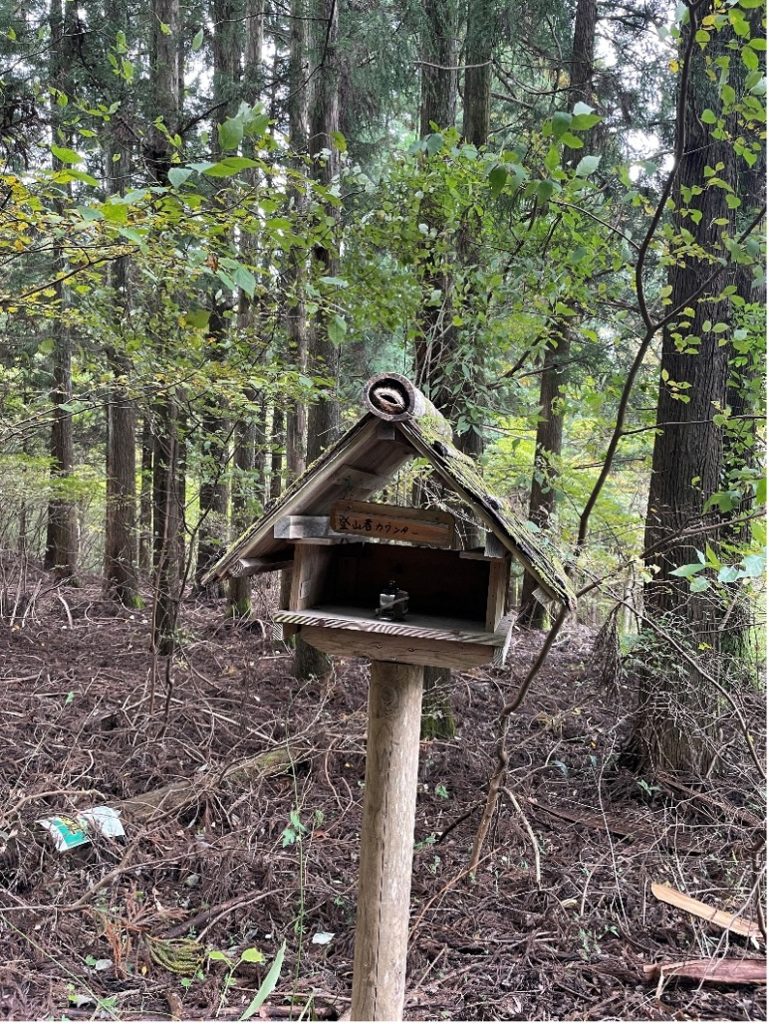 男/女坂分岐から30分足らずで林道に出ました。ここに「高川山登山口」の標識があり、妖怪ポストのような登山者カウンターが置いてありました6。