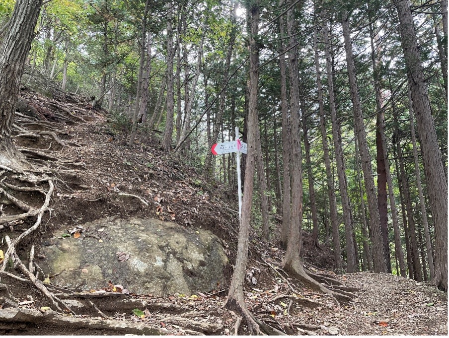 下山は初狩駅方面へ向かいます。ここで油断していたのか、湿った地面でいきなり滑りました。幸い怪我はありませんでしたが、変な具合に手をついてしまい、わきの下をつってしまいました。