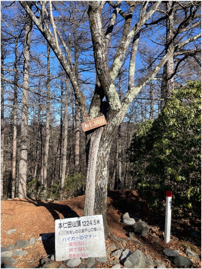 瘤高山を越えたら本仁田山はすぐそこです。少し下って登り返し、偽ピークを一つ越えると本仁田山山頂です³。先客はカップル一組のみでした。今までほとんど人に会わなかったところをみるとやはりこの山は奥多摩では地味・無名という感じなのでしょうか。