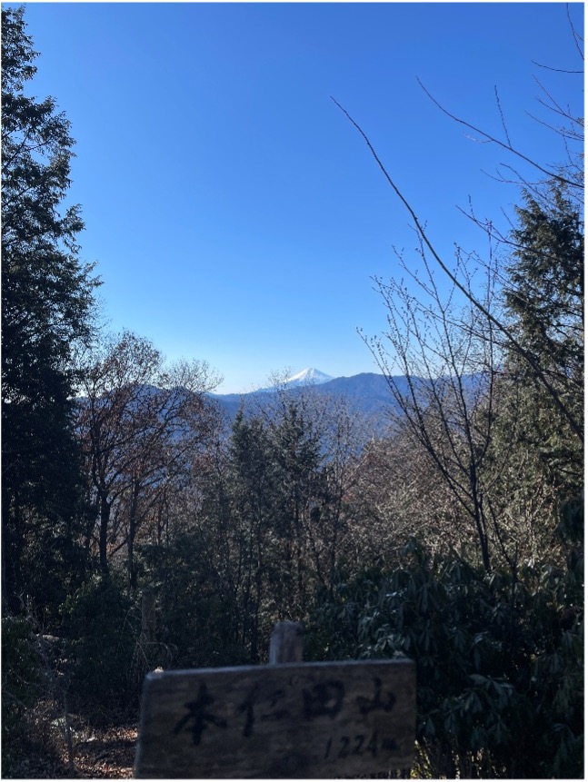 山頂は広いのですが、周囲は樹林帯で展望がありません。すこしがっかりして、とっとと下ってしまおうとリュックを背負いなおしたとき、「でも富士山が見れてよかったねー」というカップルの会話が耳に入ってきました。