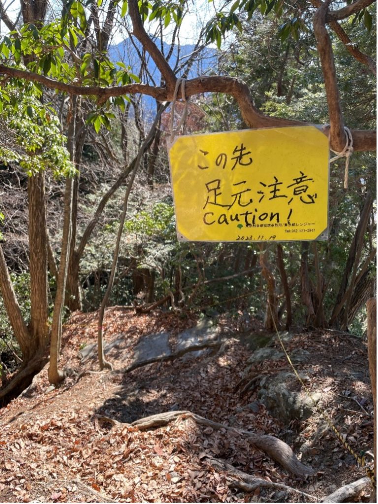 下山は大休場(おおやすんば)尾根という急登を一気に下ります。木の根や岩場が混在しているうえに落ち葉が薄く積もっており、大変滑りやすいです⁵。こんなところ登りたくないなーと思っていたのですが、結構人が登ってきました。中には半袖短パン〈!〉の人もいました。