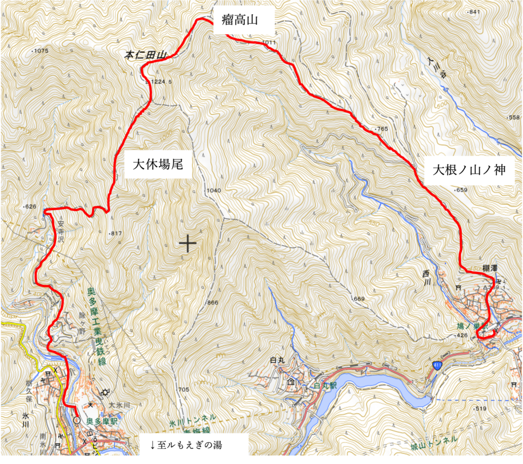 CT:8:40 鳩ノ巣駅 ‐ 9:33 大根ノ山ノ神 ‐ 10:38瘤高山山頂 ‐ 11:00本仁田山山頂‐ (大休場尾根経由)‐12:48 奥多摩駅